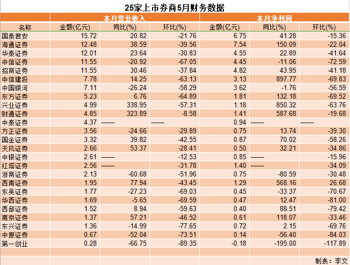 上市券商5月份財(cái)務(wù)數(shù)據(jù)今日密集披露,截至記者發(fā)稿,目前已有25家券商披露月報(bào),合計(jì)實(shí)現(xiàn)營(yíng)收125億元(母子合并數(shù)據(jù),下同),實(shí)現(xiàn)凈利潤(rùn)49.2億元。環(huán)比4月份,目前僅有1家券商實(shí)現(xiàn)凈利潤(rùn)增長(zhǎng),而營(yíng)收方面則出現(xiàn)全面下滑。