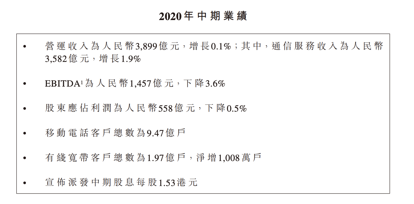 8月13日午間,中國移動(dòng)發(fā)布2020年中期業(yè)績報(bào)告顯示,上半年公司營收為3899億元,同比增長0.1%。其中,通信服務(wù)收入達(dá)到3582億元,同比增長1.9%。
