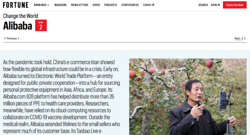 在美國(guó)《財(cái)富》雜志近日發(fā)布的“2020改變世界的企業(yè)”榜單中,阿里巴巴集團(tuán)(下稱“阿里”)第六次上榜,并首度位列榜單第二。榜單稱,阿里在疫情期間展示了其全球基礎(chǔ)設(shè)施在危機(jī)中的靈活性,特別是淘寶直播平臺(tái)在農(nóng)村供應(yīng)鏈?zhǔn)芤咔樽钄嗪螅瑤椭r(nóng)戶開拓了新用戶。