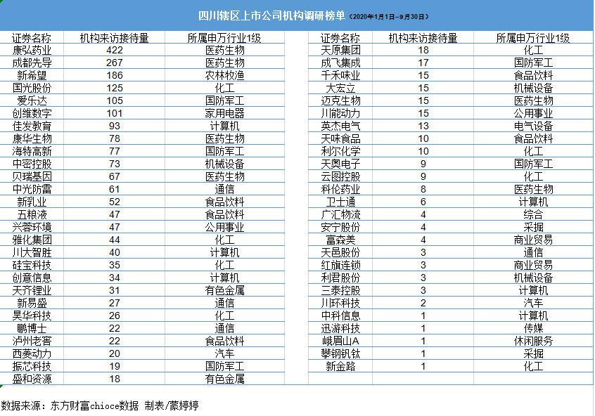 在機構(gòu)調(diào)研榜單中,6家川股上市公司今年前三季度獲百家以上機構(gòu)扎堆調(diào)研。其中,康弘藥業(yè)、成都先導(dǎo)、新希望、國光股份、愛樂達分別以422家、267家、186家、125家、105家的機構(gòu)調(diào)研數(shù)量,入圍今年前三季度川股最受機構(gòu)投資者關(guān)注排行榜的前五名。