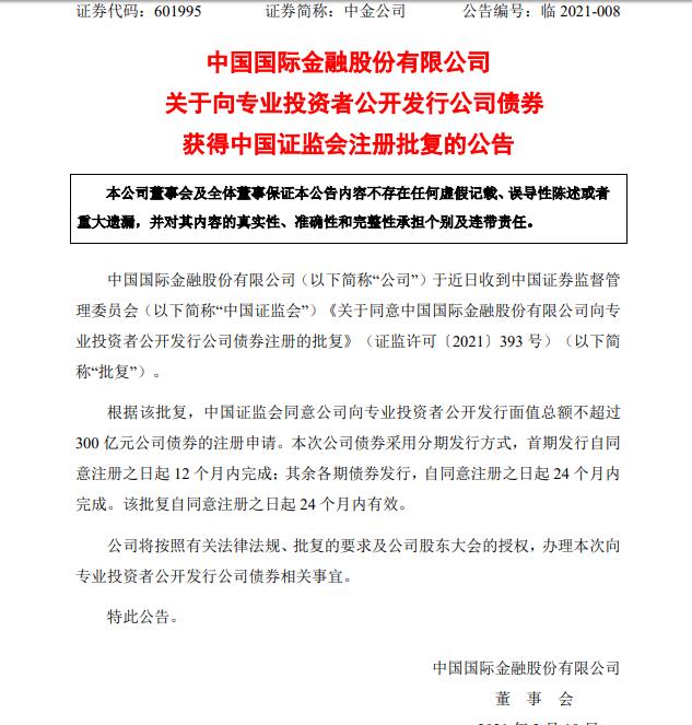 2月19日晚間,中金公司發(fā)布公告稱,于近日收到中國證監(jiān)會《關(guān)于同意中國國際金融股份有限公司向?qū)I(yè)投資者公開發(fā)行公司債券注冊的批復》(以下簡稱“批復”)。