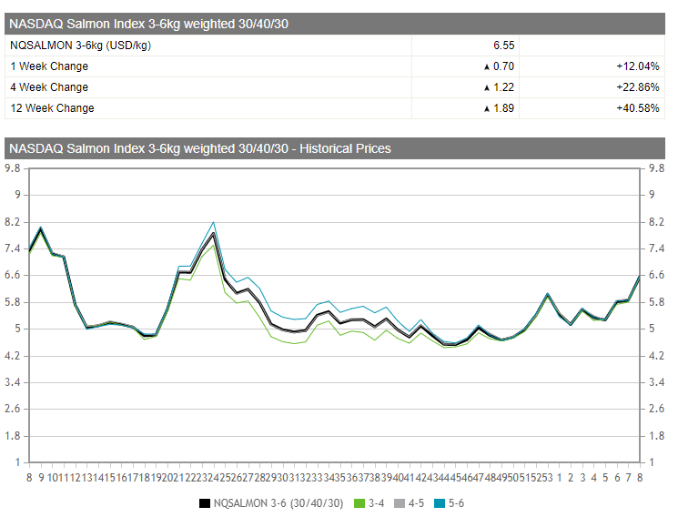 3月2日晚間,納斯達(dá)克三文魚(yú)綜合報(bào)價(jià)指數(shù)定期報(bào)告顯示,3公斤至6公斤之間的主力消費(fèi)三文魚(yú)報(bào)價(jià)為6.55美元每公斤,較前一周上漲0.70美元,環(huán)比上漲12.04%,較前4周上漲1.22美元,環(huán)比上漲22.86%,較前12周上漲1.89,環(huán)比上漲40.58%。報(bào)價(jià)走勢(shì)顯示出,新冠疫情陰霾已經(jīng)逐漸散去,全球消費(fèi)市場(chǎng)正在積極復(fù)蘇。