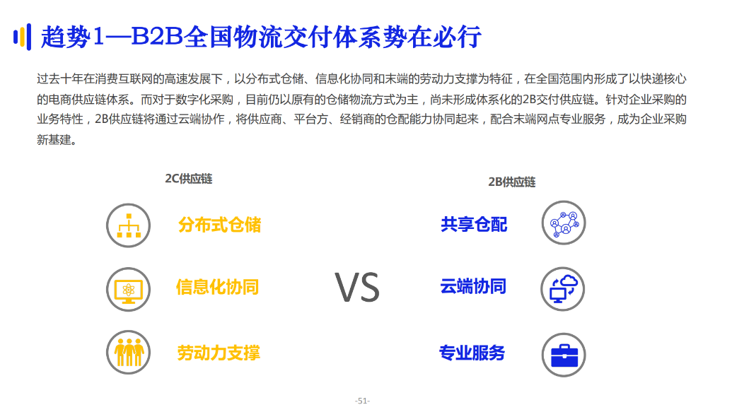 數(shù)字化采購(gòu)從政府機(jī)構(gòu)、央國(guó)企、金融機(jī)構(gòu)的陽光化采購(gòu)開始起步,當(dāng)前正逐步向大型企業(yè)、地方國(guó)企滲透。其中,大型政企客戶對(duì)采購(gòu)服務(wù)商的全國(guó)性交付網(wǎng)絡(luò)和本地服務(wù)體系十分重視。億邦智庫(kù)在報(bào)告中提出,數(shù)字化采購(gòu)市場(chǎng)發(fā)展趨勢(shì)下,B2B全國(guó)物流交付體系勢(shì)在必行。行業(yè)中許多領(lǐng)軍型企業(yè)已經(jīng)在布局全國(guó)的物流交付體系,這對(duì)整個(gè)數(shù)字化采購(gòu)市場(chǎng)的繁榮將起到巨大促進(jìn)作用。報(bào)告也指出,數(shù)字化采購(gòu)將推動(dòng)形成體系化的B2B交付供應(yīng)鏈,并將供應(yīng)商、平臺(tái)方、經(jīng)銷商的倉(cāng)配能力協(xié)同起來,配合末端網(wǎng)點(diǎn)專業(yè)服務(wù),成為企業(yè)采購(gòu)的新基建。