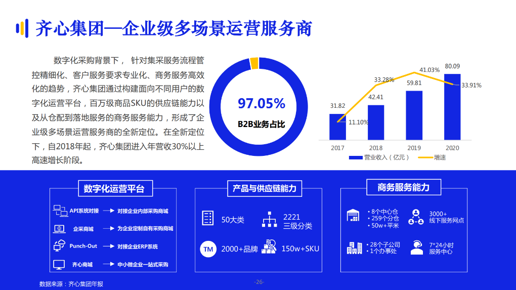 “十四五”規(guī)劃提出了“加快數(shù)字化發(fā)展,建設(shè)數(shù)字中國(guó)”的發(fā)展目標(biāo),如今電商化、云端化、智慧化、大數(shù)據(jù)化已成為中國(guó)企業(yè)數(shù)字化采購(gòu)的變革方向。企業(yè)采購(gòu)數(shù)字化轉(zhuǎn)型離不開外部平臺(tái)的協(xié)助,面對(duì)企業(yè)更多場(chǎng)景、更個(gè)性化、更深層次的采購(gòu)服務(wù)需求,采購(gòu)平臺(tái)提供一體化、定制化企業(yè)采購(gòu)解決方案的趨勢(shì)逐步加深,如齊心集團(tuán)等具備綜合服務(wù)能力的服務(wù)商將迎來重要的發(fā)展機(jī)遇。隨著采購(gòu)服務(wù)商對(duì)企業(yè)需求場(chǎng)景的不斷開發(fā),數(shù)字化采購(gòu)將會(huì)刺激企業(yè)“消費(fèi)”擴(kuò)容,這對(duì)當(dāng)前社會(huì)及國(guó)民經(jīng)濟(jì)增長(zhǎng)有極大的推動(dòng)作用。