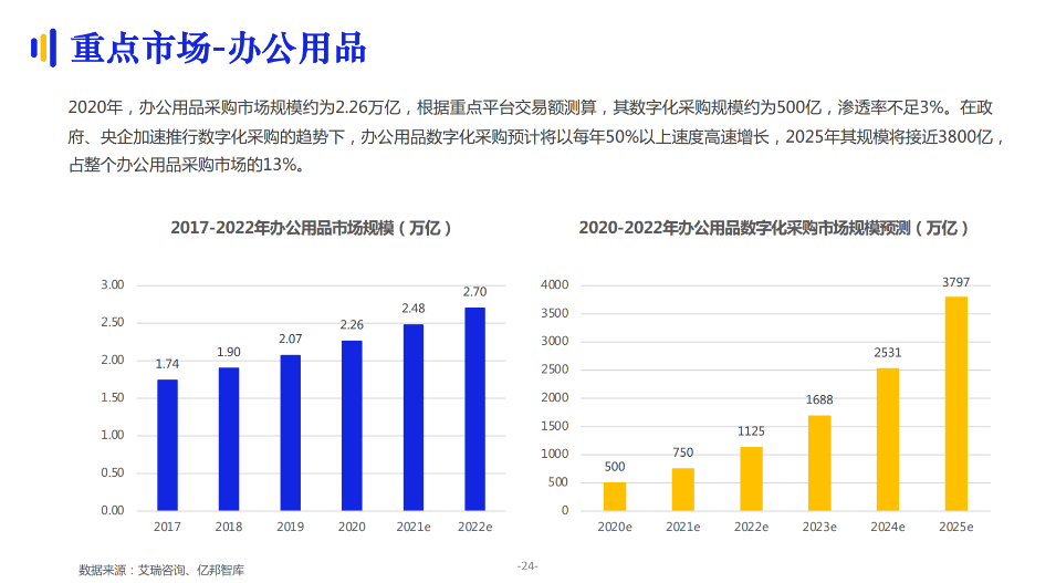 5月26日,專注于電子商務(wù)產(chǎn)業(yè)研究的億邦智庫(kù)正式發(fā)布了《2021中國(guó)數(shù)字化采購(gòu)發(fā)展報(bào)告》(以下簡(jiǎn)稱“報(bào)告”)。報(bào)告顯示,2021年數(shù)字化采購(gòu)市場(chǎng)正式進(jìn)入成長(zhǎng)期,其中以MRO工業(yè)品和辦公用品采購(gòu)數(shù)字化進(jìn)程走在前列,兩大品類市場(chǎng)規(guī)模都超過2萬億。報(bào)告預(yù)測(cè),在十萬億級(jí)、數(shù)字化滲透率不足5%的采購(gòu)市場(chǎng)內(nèi),將有希望誕生一批營(yíng)收過千億、市值過千億的雙千億平臺(tái)。