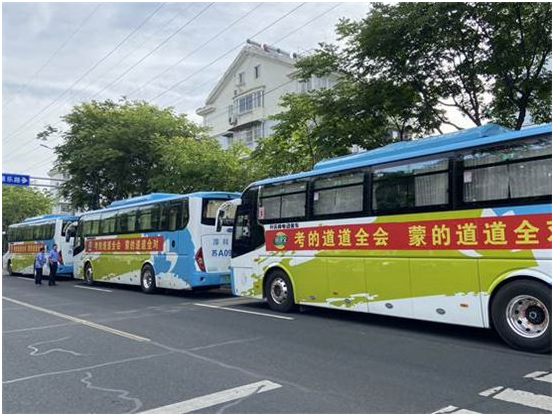 在考場外專門接送學(xué)子的道道全大巴車(供圖:道道全)