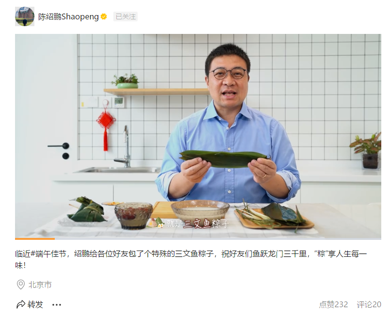 視頻中,陳紹鵬介紹了佳沃股份新推出的三文魚肉松產(chǎn)品,并親自示范如何制作三文魚肉松粽子。陳紹鵬還寄語高考學(xué)子:“祝愿高考學(xué)子們都能魚躍龍門三千里,‘粽’享人生每一味!”他略帶靦腆的笑稱:“我是一個(gè)北方人,我包粽子的手藝沒有那么熟練啊,大家不要笑話我。我也是這么多年第一次包和吃三文魚粽子。”