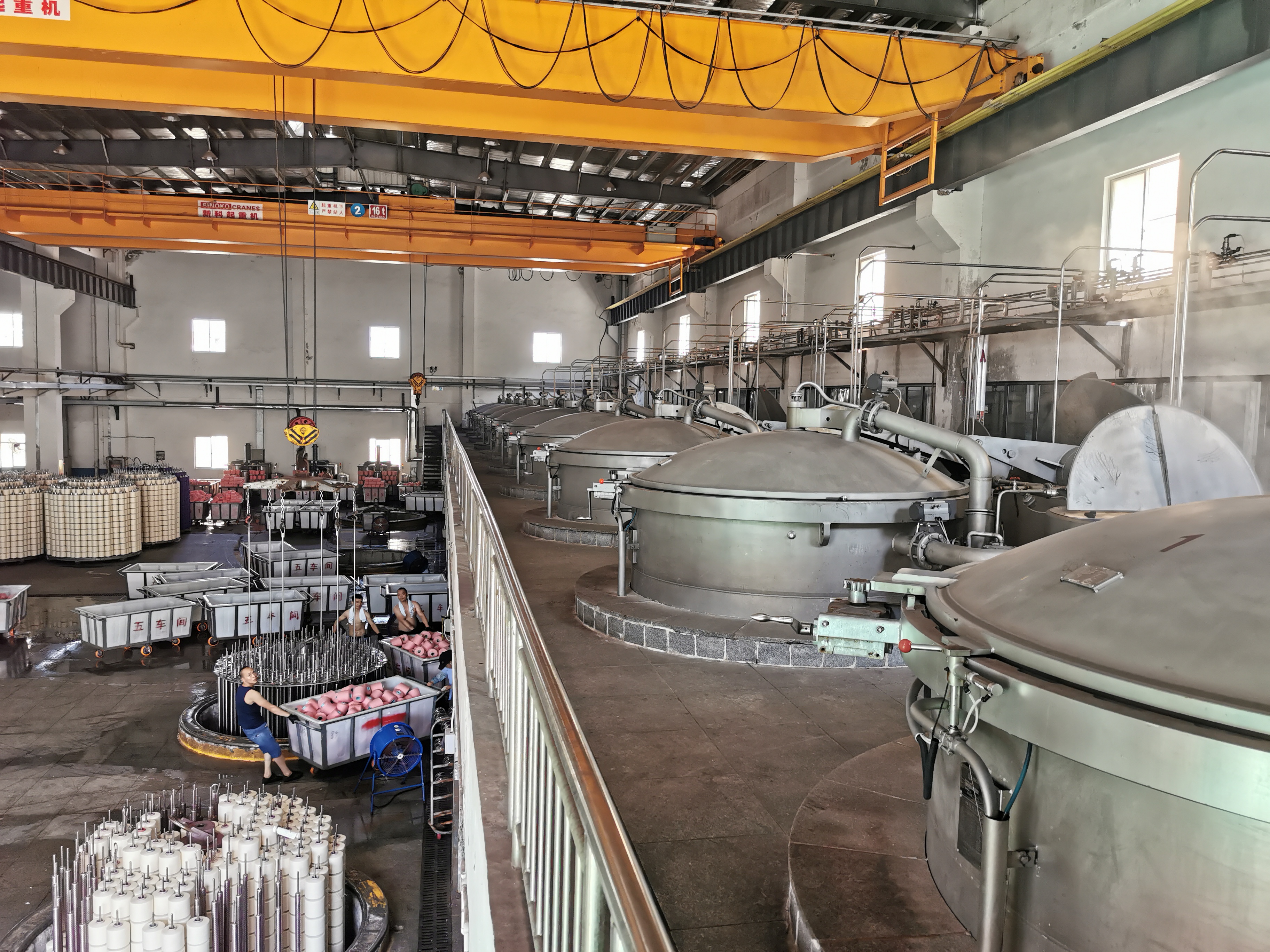 “這是我們的一個主要車間,現(xiàn)在產(chǎn)能利用率已經(jīng)超過了100%。”公司負(fù)責(zé)人向記者介紹。記者在車間里看到,多個大型染缸向外不斷噴射出蒸汽,忙碌的工人們正將一堆堆的筒子紗投向染缸。
