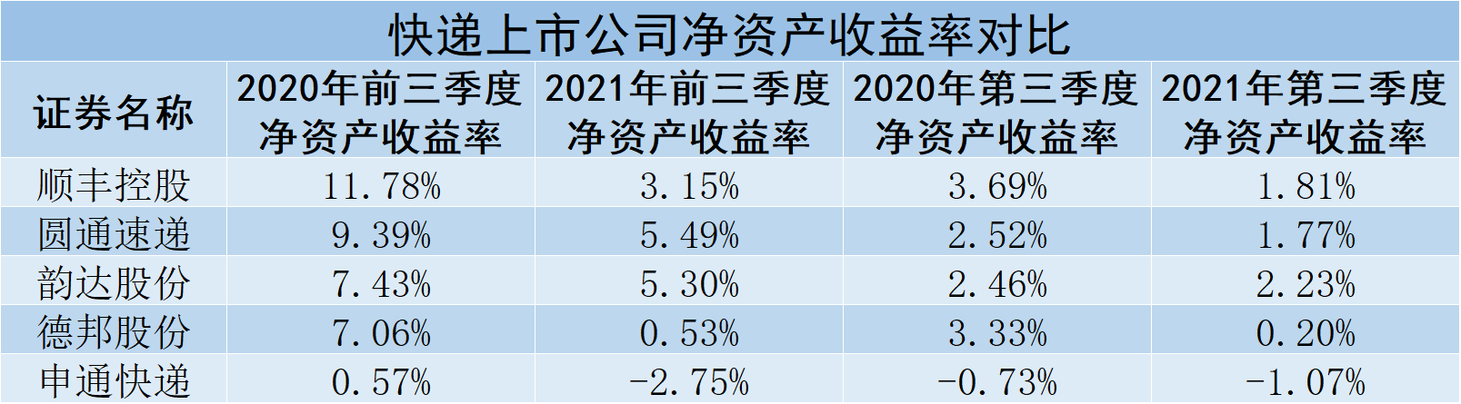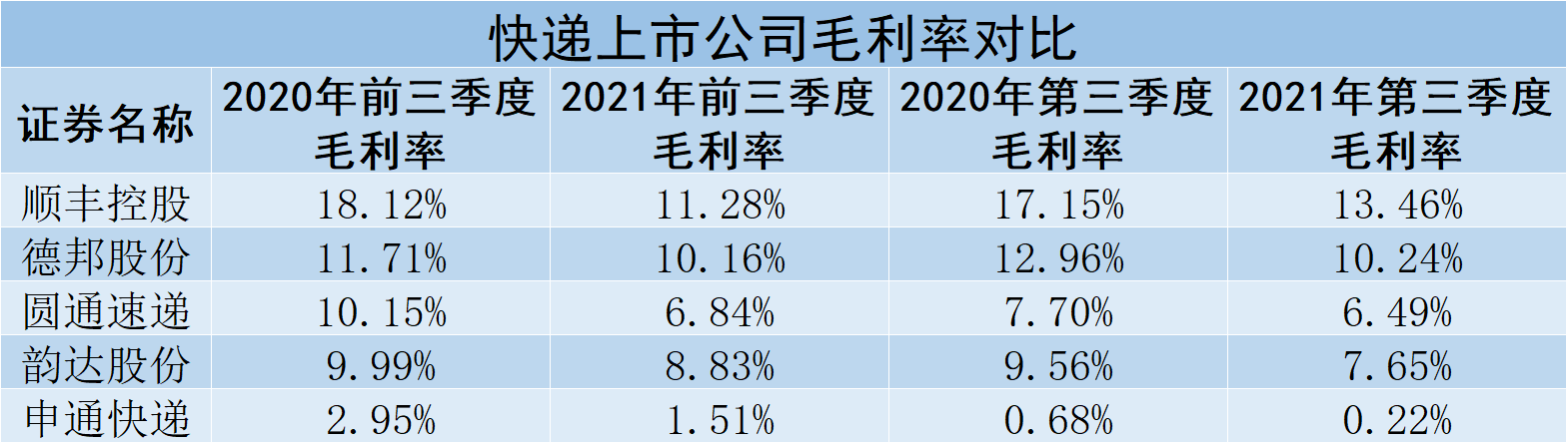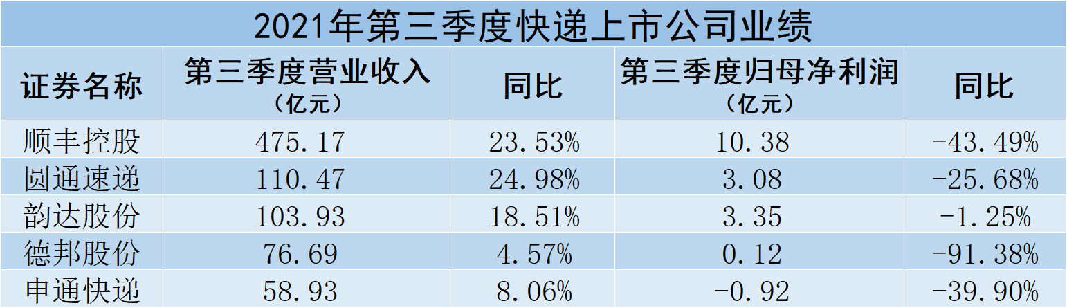 從2021年第三季度快遞上市公司業(yè)績(jī)來(lái)看,5家公司第三季度依舊延續(xù)增收不增利的態(tài)勢(shì)。5家公司第三季度實(shí)現(xiàn)營(yíng)業(yè)收入平均增長(zhǎng)15.93%;剔除第三季度歸母凈利潤(rùn)虧損的申通快遞,其余4家公司歸母凈利潤(rùn)同比平均下降40.45%。