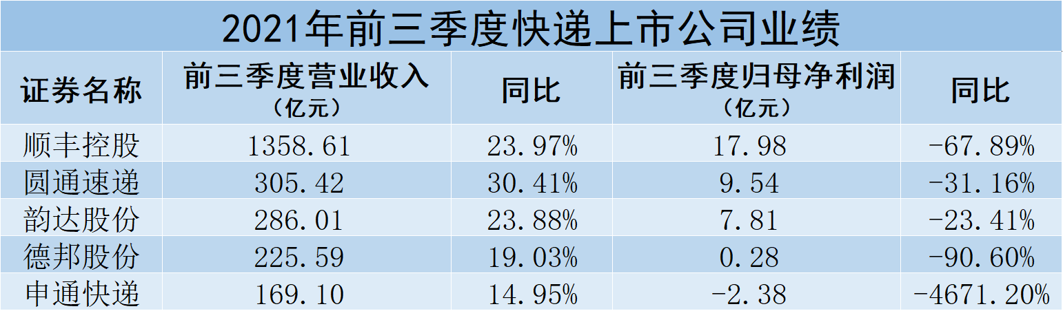 從2021年前三季度快遞上市公司業(yè)績(jī)來(lái)看,5家公司前三季度營(yíng)業(yè)收入均實(shí)現(xiàn)不同程度增長(zhǎng),平均增幅為22.45%。然而在實(shí)現(xiàn)歸母凈利潤(rùn)方面,5家公司都呈現(xiàn)不同程度的下滑;剔除前三季度歸母凈利潤(rùn)虧損的申通快遞,其余4家公司歸母凈利潤(rùn)同比平均下降53.26%。