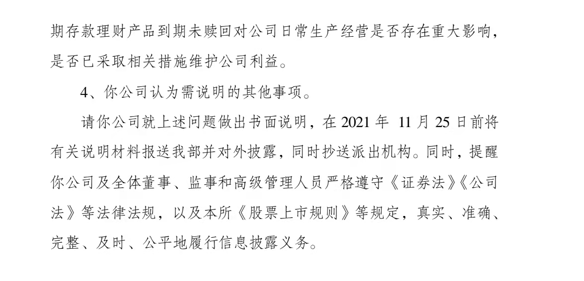 同時,深交所要求公司年審會計師結(jié)合公司2020年底銀行存款詢證函回函情況,補(bǔ)充說明相關(guān)審計程序是否充分,所獲審計證據(jù)是否準(zhǔn)確,公司2020年年報關(guān)于銀行存款質(zhì)押狀態(tài)的披露是否存在真實準(zhǔn)確。并結(jié)合公司2021年三季度末貨幣資金余額,補(bǔ)充說明到期未贖回期存款理財產(chǎn)品對公司日常生產(chǎn)經(jīng)營是否存在重大影響,是否已采取相關(guān)措施維護(hù)公司利益。