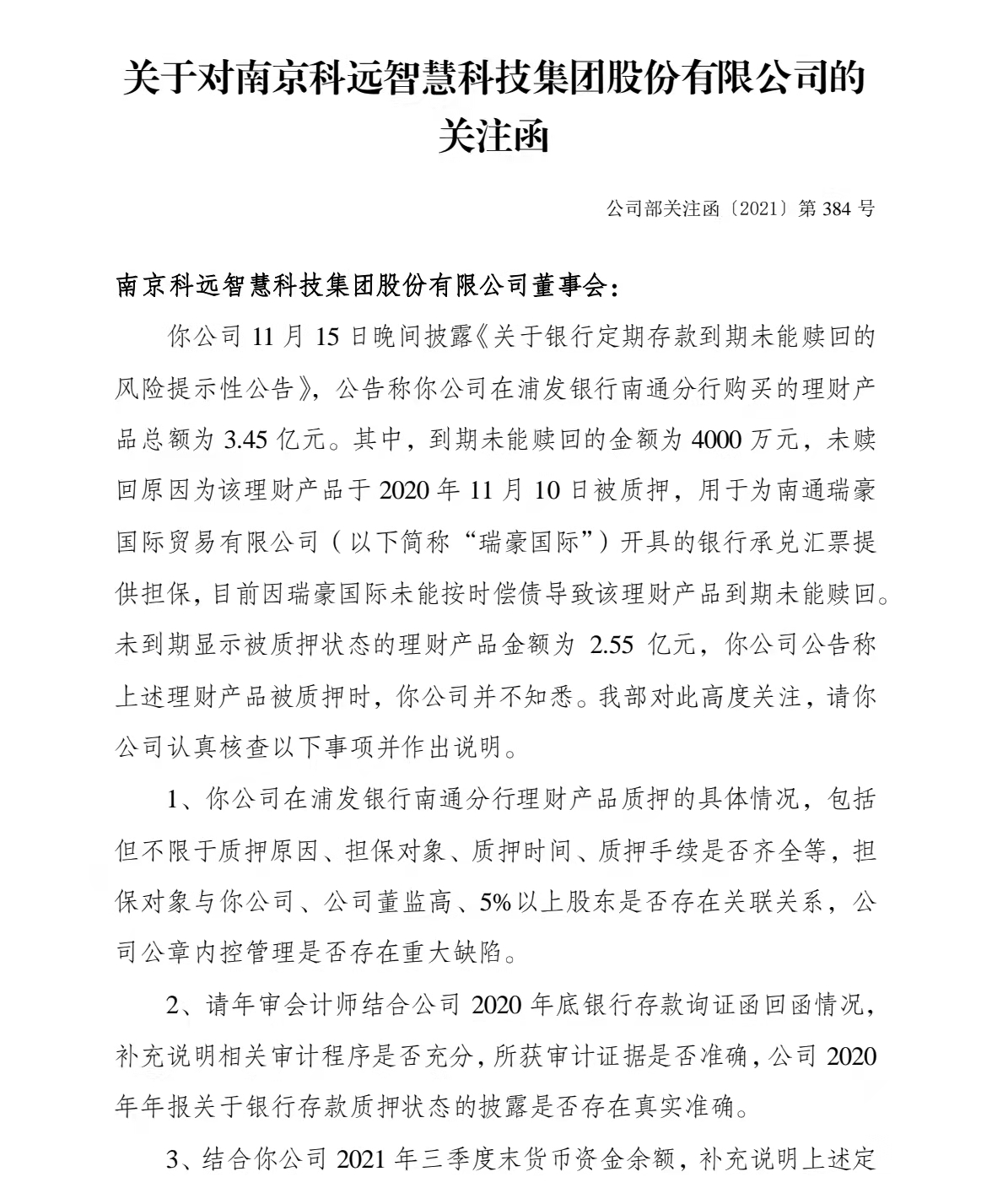 科遠(yuǎn)智慧3億元存款遭質(zhì)押擔(dān)保一事持續(xù)引發(fā)市場關(guān)注,11月17日,深交所向公司下發(fā)關(guān)注函,要求公司認(rèn)真核查并說明在浦發(fā)銀行南通分行理財產(chǎn)品質(zhì)押的具體情況。