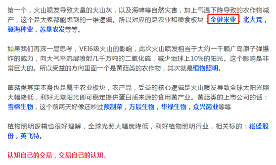 在這一舉動的背后,還有游資精心布局,一部分A股標(biāo)的物被整理出來,貼上“火山利好”概念,概念炒作、操縱股價、高位派發(fā)的“擊鼓傳花”游戲已是蓄勢待發(fā)。主業(yè)是糧油深加工的金健米業(yè)也被自媒體標(biāo)上“火山利好”概念。