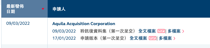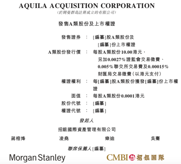 3月9日,《證券日?qǐng)?bào)》記者從港交所披露易平臺(tái)了解到,港交所首家遞表SPAC公司Aquila Acquisition Corporation(簡(jiǎn)稱“AAC”)已通過(guò)港交所上市聆訊,并披露聆訊后的招股書。1月17日,AAC向港交所提交上市申請(qǐng)書,發(fā)起人為招銀國(guó)際及AAC管理團(tuán)隊(duì)成員,摩根士丹利及招銀國(guó)際擔(dān)任聯(lián)席保薦人。