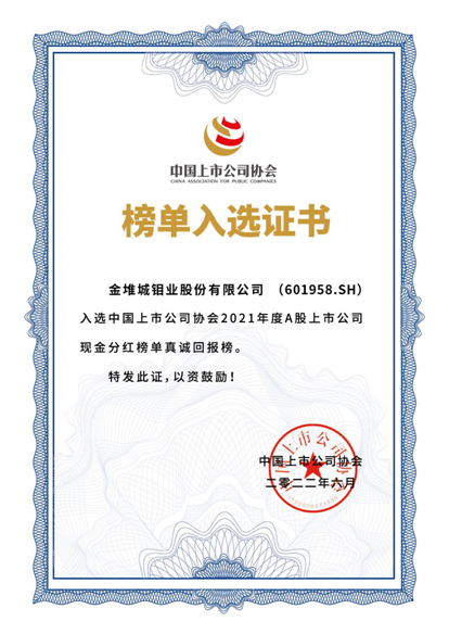 近日,中國上市公司協(xié)會(huì)發(fā)布了A股上市公司現(xiàn)金分紅榜單,該榜單包括“上市公司豐厚回報(bào)榜單”和“上市公司真誠回報(bào)榜單”各200家。其中,金鉬股份上榜上市公司真誠回報(bào)榜單。