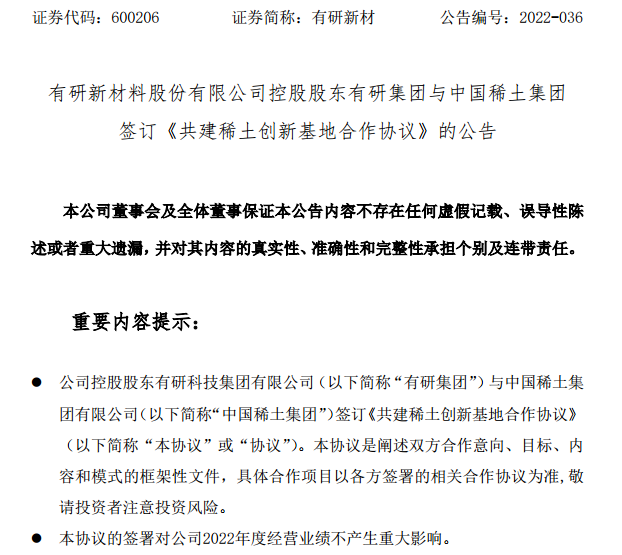 7月20日,有研新材料股份有限公司(下稱“有研新材”)發(fā)布公告稱,其公司控股股東有研科技集團有限公司(以下簡稱“有研集團”)與中國稀土集團有限公司(以下簡稱“中國稀土集團”)于7月19日在北京簽訂《共建稀土創(chuàng)新基地合作協(xié)議》,旨在充分發(fā)揮雙方各自特色優(yōu)勢,共同促進稀土產業(yè)綠色可持續(xù)發(fā)展。