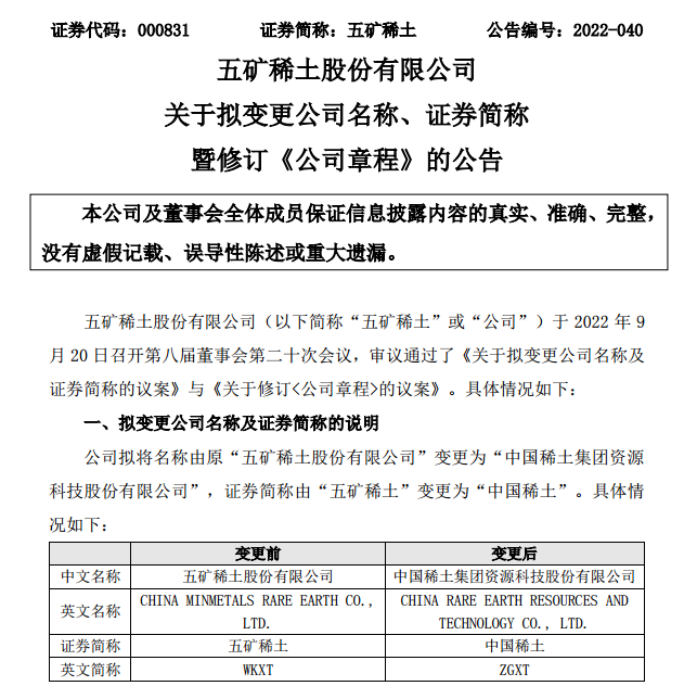 中國(guó)稀土集團(tuán)資源科技股份有限公司其實(shí)是由五礦稀土更名而來(lái)。9月20日晚間,五礦稀土發(fā)布公告稱,公司擬將名稱由原“五礦稀土股份有限公司”變更為“中國(guó)稀土集團(tuán)資源科技股份有限公司”,證券簡(jiǎn)稱由“五礦稀土”變更為“中國(guó)稀土”。