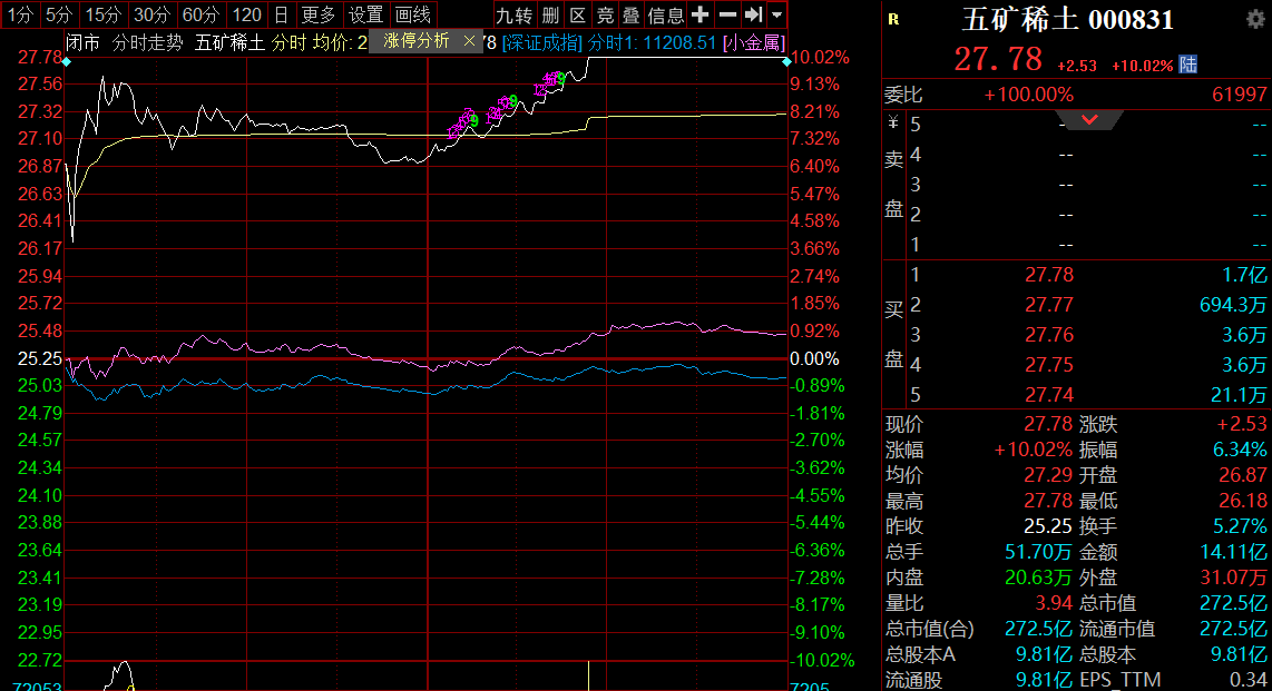受此消息影響,9月21日早盤(pán),五礦稀土開(kāi)盤(pán)大漲,當(dāng)日以漲停收盤(pán),報(bào)27.78元/股。