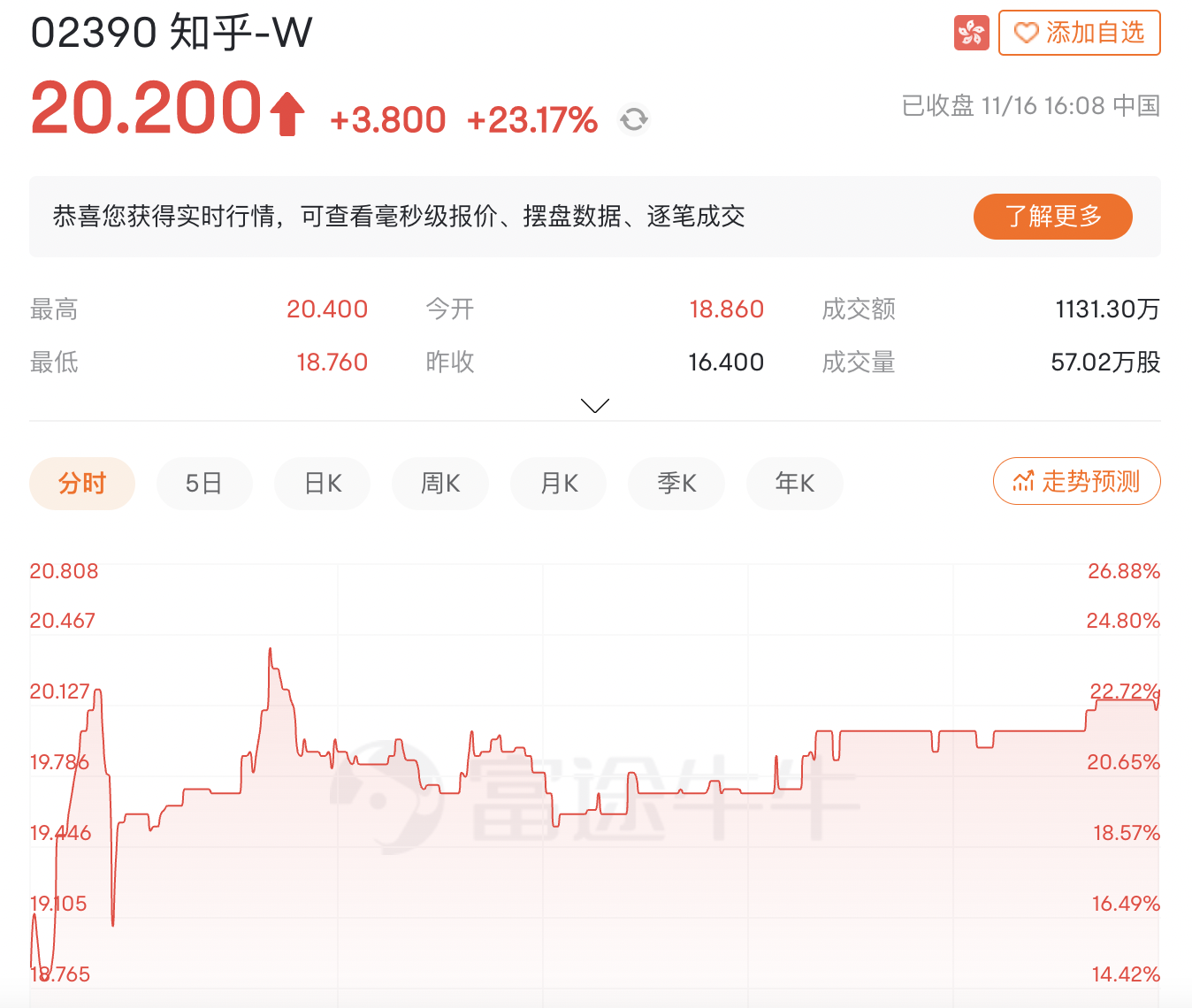 11月16日消息,知乎在美股和港股市場均迎來大漲。北京時間2022年11月15日,知乎美股盤中大漲逾33%,最終收盤1.27美元,漲幅24.51%。北京時間2022年11月16日,知乎港股延續(xù)了上漲趨勢,盤中最大漲幅達到24.39%,收盤報20.2港元,最終上漲達到23.17%。