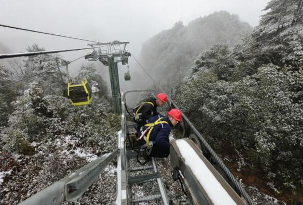 近日,張家界連降大雪。1月2日,張家界旅游集團(tuán)股份有限公司在打出“冬游張家界,暢享人間仙境”的同時(shí),加強(qiáng)安全防護(hù)工作,數(shù)百名員工除冰掃雪,保護(hù)山道、索道及景觀設(shè)施安全。公司工作人員向記者介紹,“我們采取一天兩班、一日一檢的方式巡查旅游線路上的關(guān)鍵點(diǎn),為春節(jié)游客守護(hù)平安。”