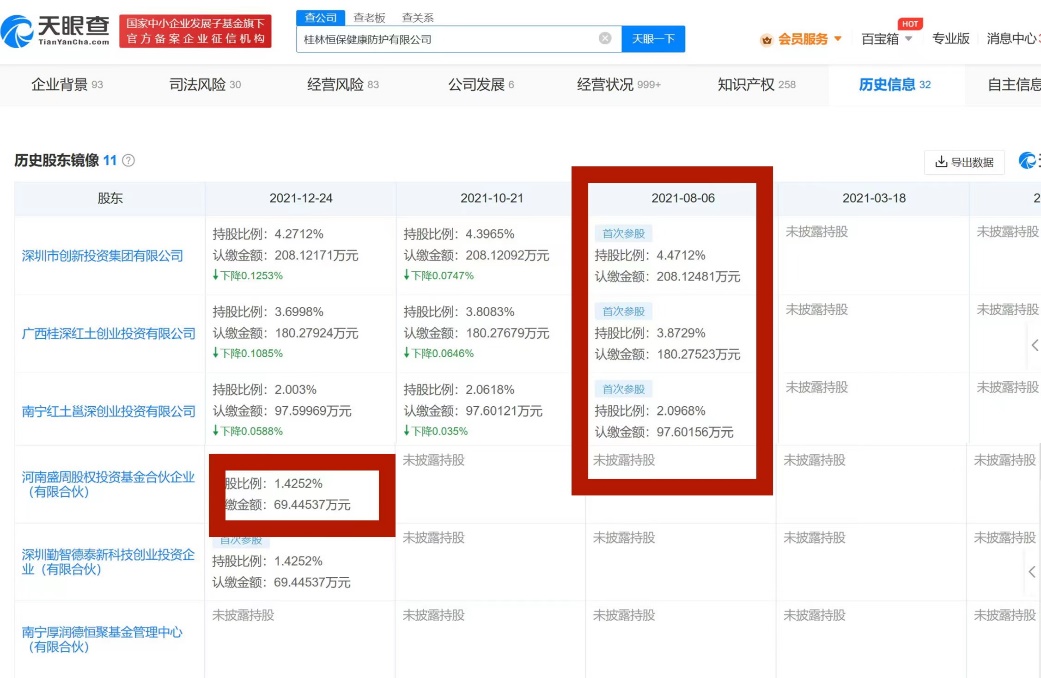 根據(jù)天眼查APP顯示,深圳市創(chuàng)新投資集團(tuán)有限公司、廣西桂深紅土創(chuàng)業(yè)投資有限公司、南寧紅土邕深創(chuàng)業(yè)投資有限公司首次參股時(shí)間為2021年8月6日,河南盛周股權(quán)投資基金合伙企業(yè)(有限合伙)首次參股時(shí)間為2021年12月24號。本次交易后上述公司將不再持有恒保健康股權(quán)。