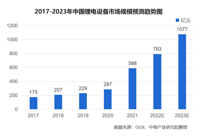 近年,全球動力電池需求量大幅增加,未來幾年動力電池仍將持續(xù)緊缺,電池產(chǎn)能擴產(chǎn)將持續(xù)拉動鋰電池裝備行業(yè)。據(jù)GGII預計,2025年全球動力電池出貨量將達到1550GWh,2030年有望達到3000GWh。而2021年中國鋰電設備市場規(guī)模為588億元,2017年至2021年市場規(guī)模年均復合增長率為27.4%,預計2023年中國鋰電設備市場規(guī)模將達1077億元。