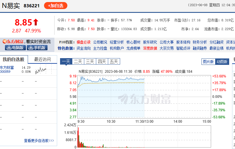 上市首日,易實精密大幅高開。易實精密開盤價為7.50元/股,上漲25.42%。開盤后股價繼續(xù)攀升,最高漲超50%。截至早盤收盤,易實精密股價收于8.85元/股,漲幅達47.99%,換手率57.77%,成交額1.21億元,總市值8.32億元。