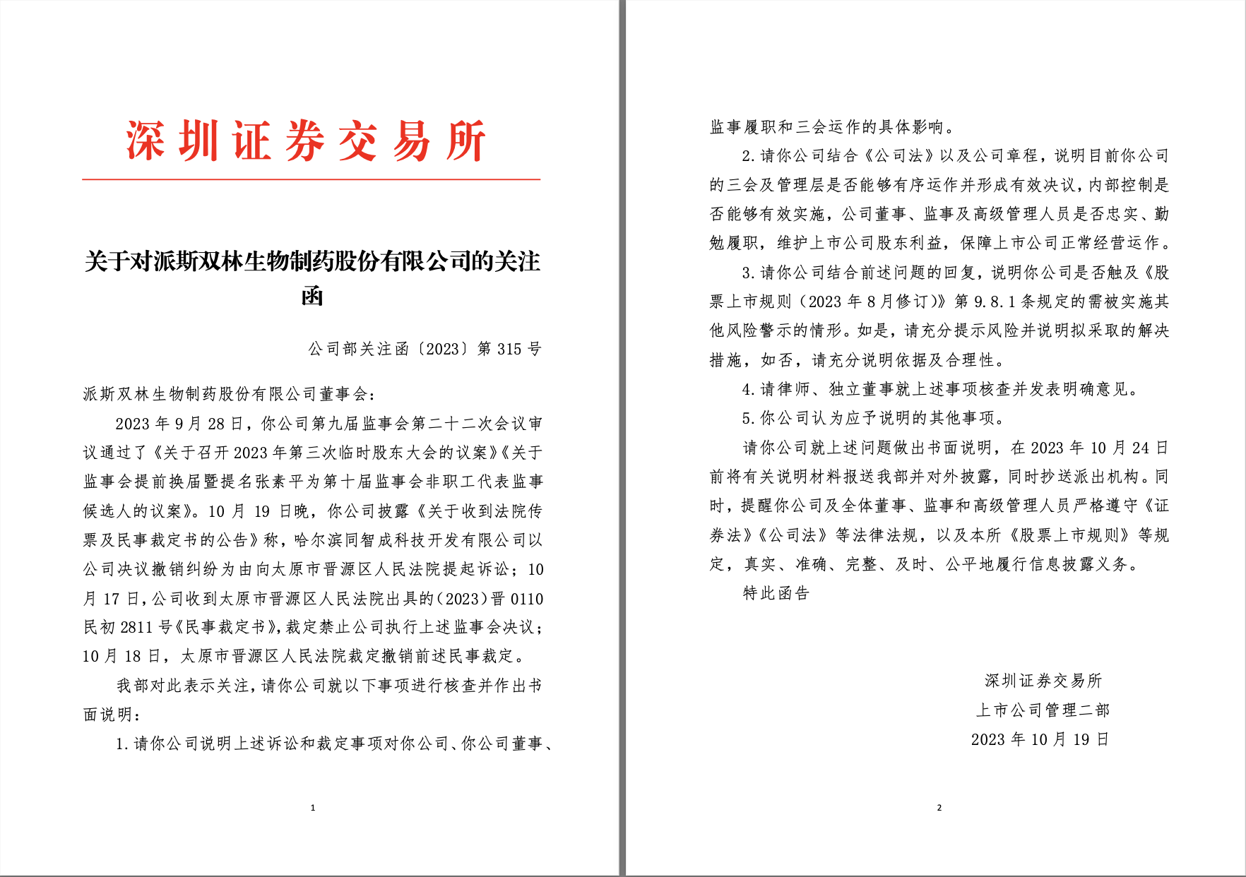 就在派林生物發(fā)布收到法院傳票及民事裁定書的公告當(dāng)晚,深交所火速向派林生物發(fā)布關(guān)注函,要求公司說明三會及管理層是否能夠有序運(yùn)作并形成有效決議,內(nèi)部控制是否能夠有效實施,公司董事、監(jiān)事及高級管理人員是否忠實、勤勉履職,維護(hù)上市公司股東利益,保障上市公司正常經(jīng)營運(yùn)作;同時還要求公司說明是否觸及相關(guān)規(guī)定的需被實施其他風(fēng)險警示的情形。