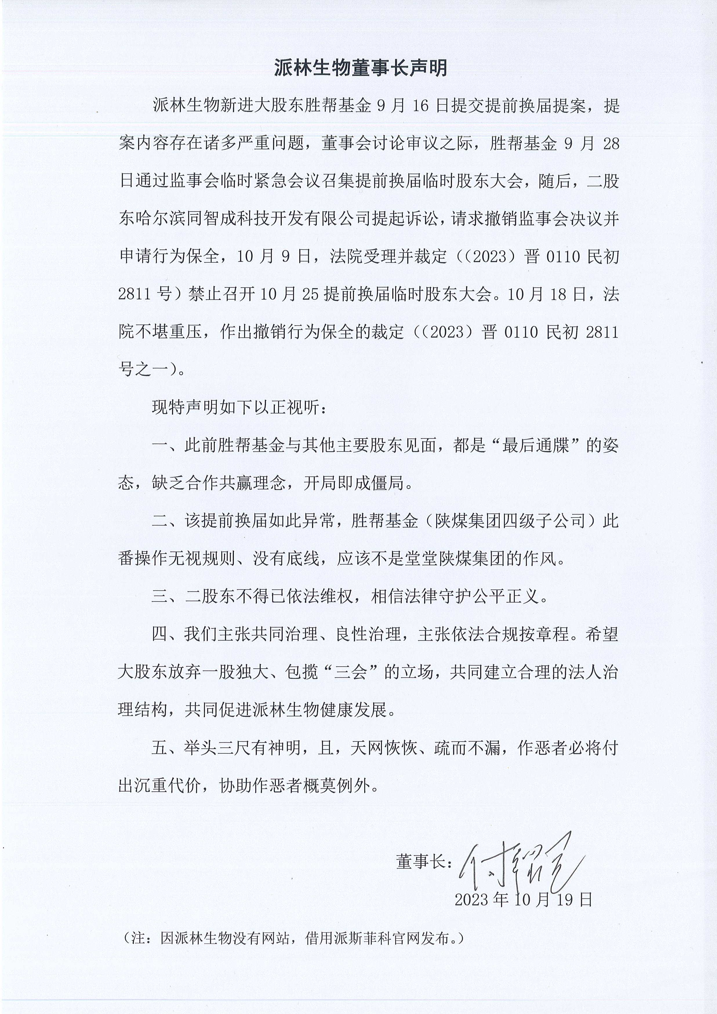 付紹蘭在聲明中表示,一、此前勝幫基金與其他主要股東見面,都是“最后通牒”的姿態(tài),缺乏合作共贏理念,開局即成僵局;二、該提前換屆如此異常,勝幫基金(陜煤集團(tuán)四級子公司)此番操作無視規(guī)則、沒有底線,應(yīng)該不是堂堂陜煤集團(tuán)的作風(fēng);三、二股東不得已依法維權(quán),相信法律守護(hù)公平正義;四、我們主張共同治理、良性治理,主張依法合規(guī)按章程。希望大股東放棄一股獨大、包攬“三會”的立場,共同建立合理的法人治理結(jié)構(gòu),共同促進(jìn)派林生物健康發(fā)展;五、舉頭三尺有神明,且,天網(wǎng)恢恢、疏而不漏,作惡者必將付出沉重代價,協(xié)助作惡者概莫例外。