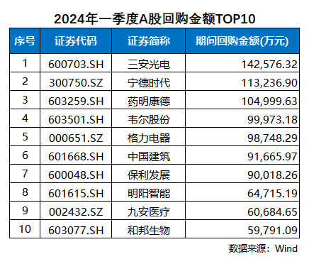 2024年以來,A股支持回購力度持續(xù)加大,回購金額創(chuàng)新高。Wind數(shù)據(jù)顯示,2024年第一季度有1275家A股上市公司已經(jīng)實施了回購,已回購金額總計約578億元。其中,第一季度已回購金額超過10億元的上市公司有3家,藥明康德以約10.5億元回購規(guī)模位列醫(yī)藥板塊第一。