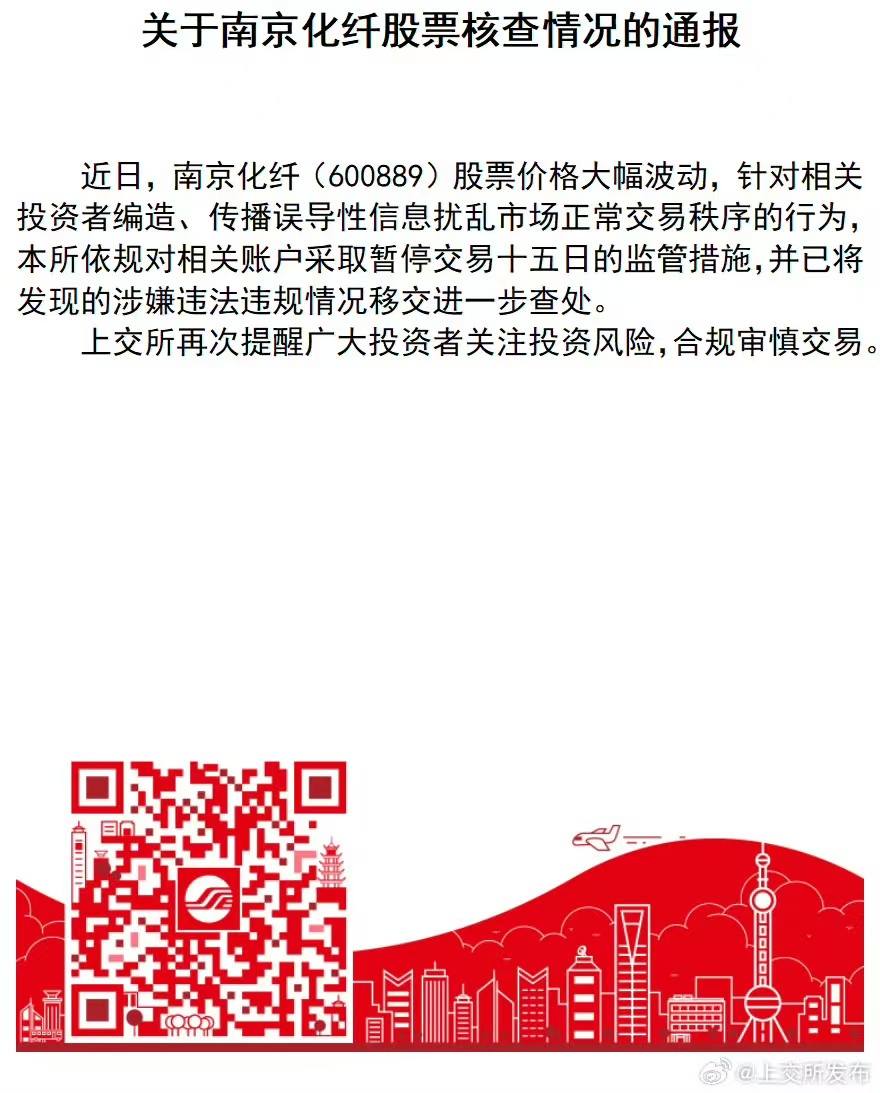 5月21日深夜,上交所發(fā)布《關(guān)于南京化纖股票核查情況的通報(bào)》(以下簡(jiǎn)稱《通報(bào)》)?!锻▓?bào)》指出,近日,南京化纖股票價(jià)格大幅波動(dòng),針對(duì)相關(guān)投資者編造、傳播誤導(dǎo)性信息擾亂市場(chǎng)正常交易秩序的行為,上交所依規(guī)對(duì)相關(guān)賬戶采取暫停交易十五日的監(jiān)管措施,并已將發(fā)現(xiàn)的涉嫌違法違規(guī)情況移交進(jìn)一步查處。上交所提醒廣大投資者關(guān)注投資風(fēng)險(xiǎn),合規(guī)審慎交易。