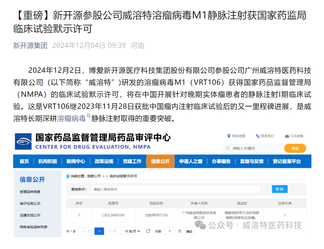 這是VRT106繼2023年11月28日獲批中國瘤內(nèi)注射臨床試驗后的又一里程碑進(jìn)展,是威溶特長期深耕溶瘤病毒靜脈注射取得的重要突破。