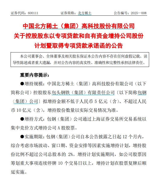 北方稀土稱,基于對(duì)公司未來(lái)發(fā)展前景的信心及中長(zhǎng)期投資價(jià)值的認(rèn)可,助力公司做好市值管理,提振投資者信心,切實(shí)維護(hù)投資者利益,促進(jìn)公司持續(xù)、穩(wěn)定、健康、高質(zhì)量發(fā)展,控股股東包鋼集團(tuán)擬增持公司股份。