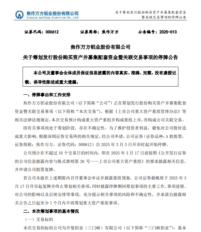 焦作萬方股票自2025年3月3日開市時起開始停牌,預(yù)計停牌不超過10個交易日。