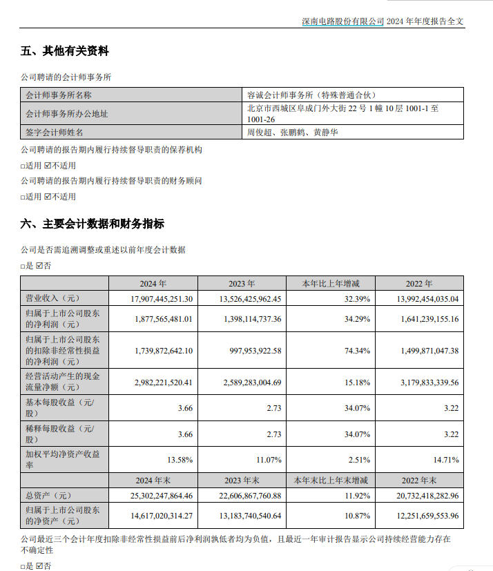 3月12日晚間,深南電路股份有限公司(以下簡(jiǎn)稱“深南電路”或“公司”,002916)披露的年報(bào)顯示,公司2024年實(shí)現(xiàn)營業(yè)總收入179.07億元,同比增長(zhǎng)32.39%;實(shí)現(xiàn)歸屬于上市公司股東的凈利潤(rùn)18.78億元,同比增長(zhǎng)34.29%;實(shí)現(xiàn)歸屬于上市公司股東的扣除非經(jīng)常性損益的凈利潤(rùn)為17.4億元,同比上升74.34%。