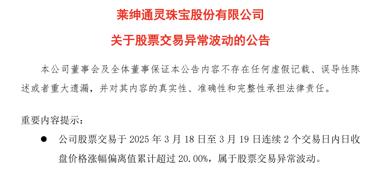 3月19日晚,萊紳通靈發(fā)布公告稱,公司股票交易于3月18日至3月19日連續(xù)2個(gè)交易日內(nèi)日收盤價(jià)格漲幅偏離值累計(jì)超過20.00%,根據(jù)《上海證券交易所股票交易規(guī)則》等有關(guān)規(guī)定,屬于股票交易異常波動(dòng)。