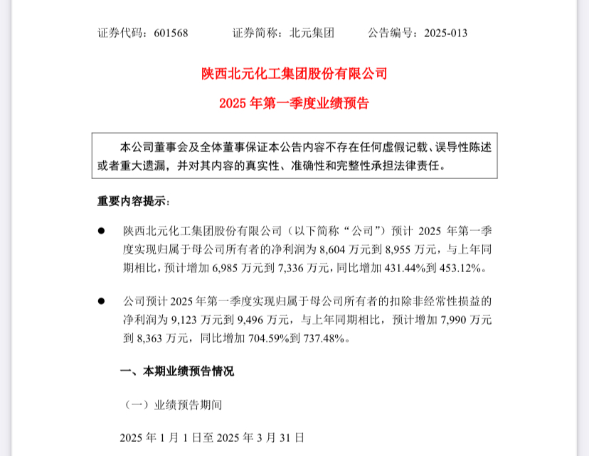 4月10日晚間,陜西北元化工集團(tuán)股份有限公司(以下簡(jiǎn)稱“北元集團(tuán)”證券代碼:601568)披露2025年第一季度業(yè)績(jī)預(yù)告,預(yù)計(jì)2025年第一季度實(shí)現(xiàn)歸屬于母公司所有者的凈利潤(rùn)為8604萬元到8955萬元,同比增長(zhǎng)431.44%到453.12%;預(yù)計(jì)2025年第一季度實(shí)現(xiàn)歸屬于母公司所有者的扣除非經(jīng)常性損益的凈利潤(rùn)為9123萬元到9496萬元,同比增長(zhǎng)704.59%到737.48%。
