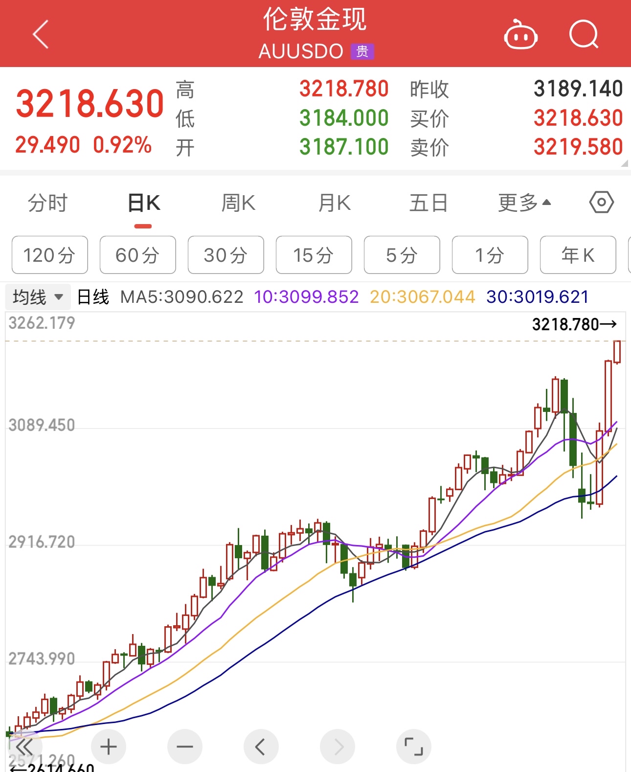 本報訊 (記者李靜)4月11日,現(xiàn)貨黃金站上3200美元/盎司,再創(chuàng)歷史新高。截至發(fā)稿,現(xiàn)貨黃金報3218.63美元/盎司。