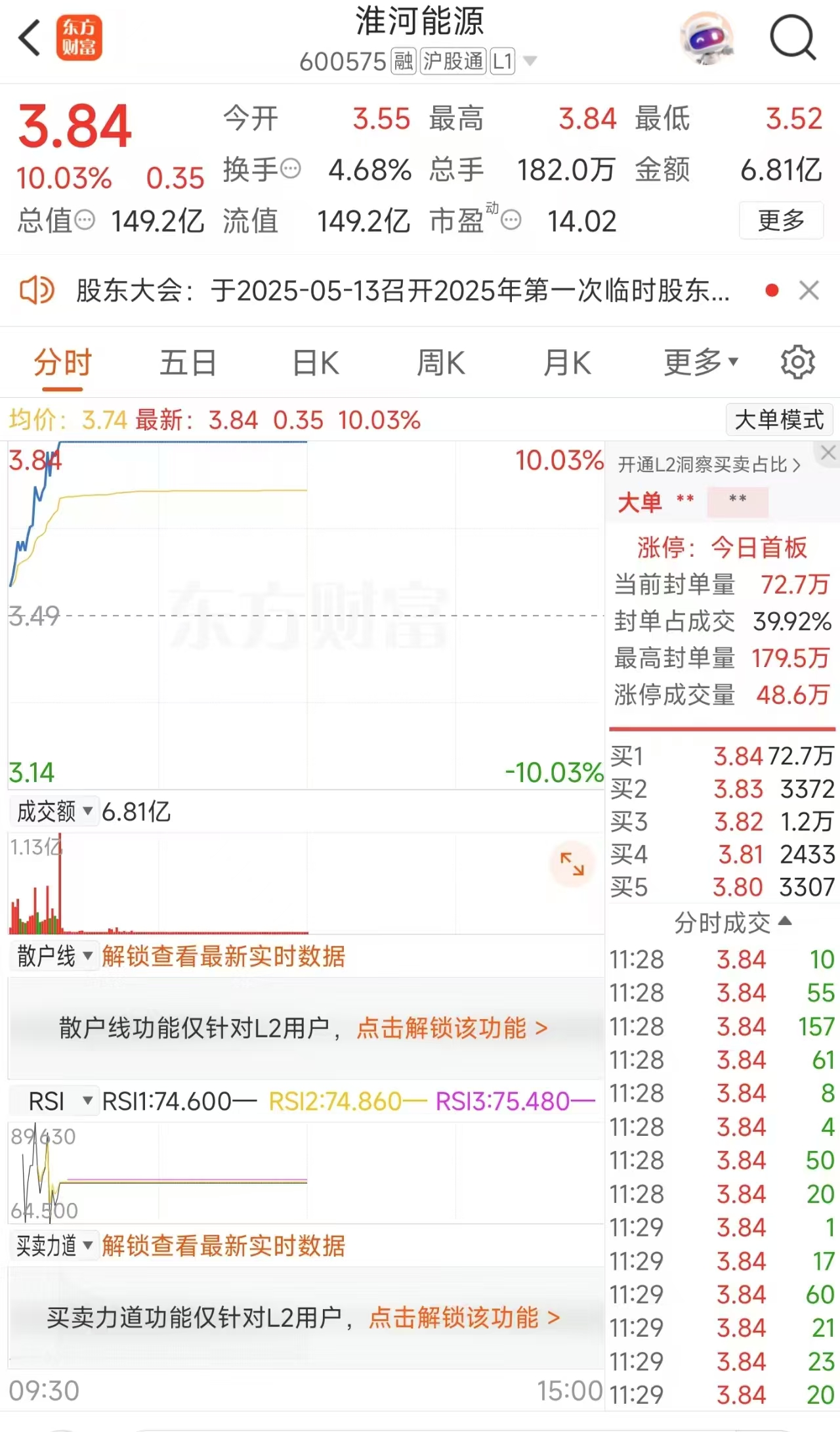 5月9日,淮河能源(集團(tuán))股份有限公司(以下簡(jiǎn)稱(chēng)“淮河能源”,證券代碼:600575)開(kāi)盤(pán)后不久便強(qiáng)勢(shì)漲停,截至午間收盤(pán),該股報(bào)3.84元/股,成交額6.81億元。