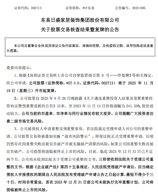 公告顯示,公司股票自2025年9月26日晚披露《關(guān)于遴選重整投資人結(jié)果及簽署重整投資協(xié)議暨預(yù)重整進(jìn)展的公告》以來,至2025年11月13日價(jià)格漲幅為241.59%。為維護(hù)投資者利益,公司股票自2025年11月14日開市起停牌核查,于2025年11月19日(星期三)開市起復(fù)牌。