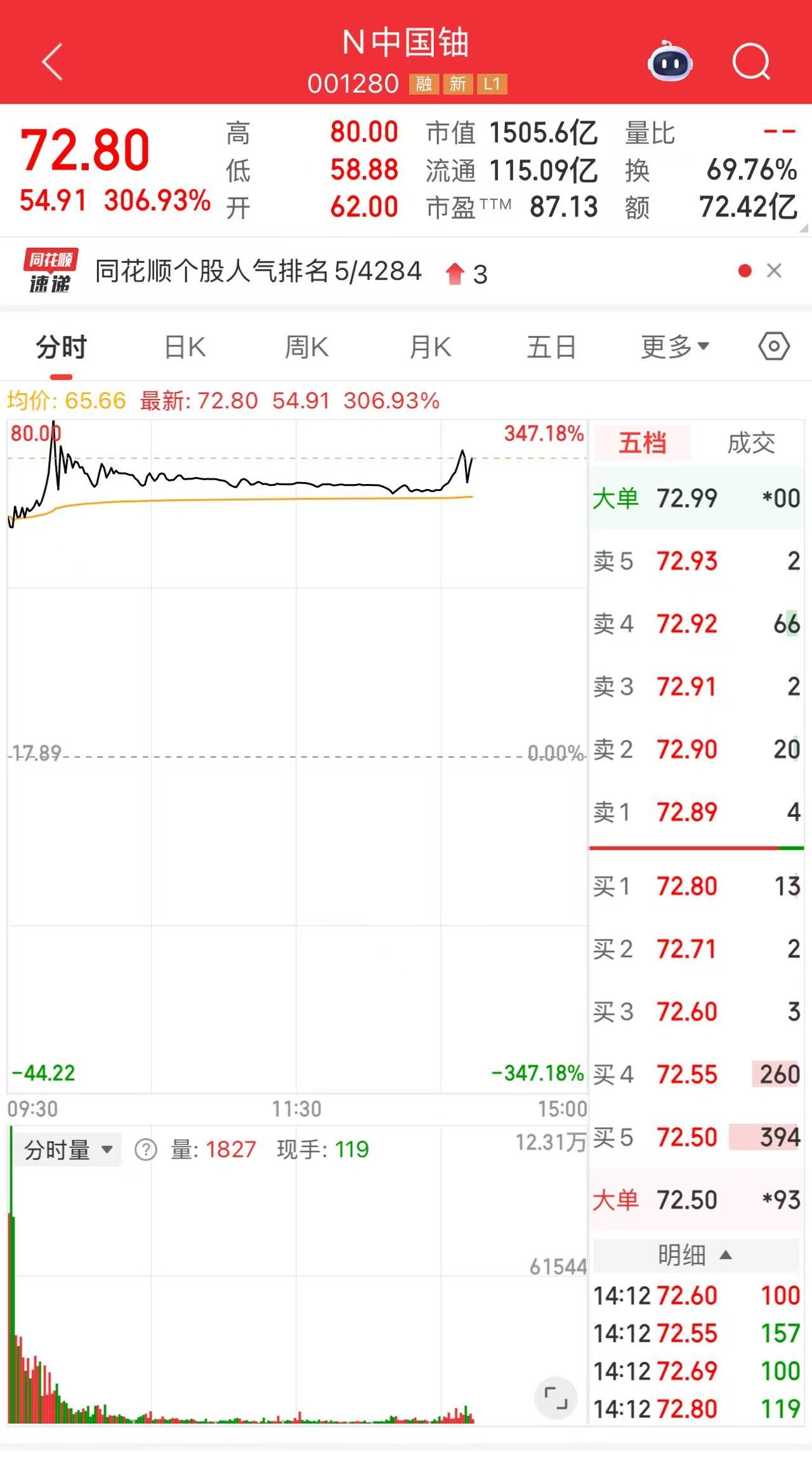 本報訊 (記者向炎濤)12月3日,中國鈾業(yè)股份有限公司(以下簡稱“中國鈾業(yè)”,證券代碼:001280)在深交所主板掛牌上市,成為A股市場天然鈾第一股。公司發(fā)行價格為17.89元/股,開盤價為62元/股,漲幅達246.56%。開盤后,公司股價繼續(xù)飆升,一度沖至最高80元/股,盤中最高漲幅達347.18%。