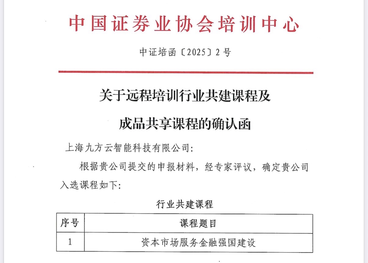 在金融強國戰(zhàn)略加速推進的背景下,高質量金融人才的培養(yǎng)已成為支撐資本市場健康發(fā)展的核心要素。此前,中國證券業(yè)協會培訓中心下發(fā)《關于遠程培訓行業(yè)共建課程及成品共享課程的確認函》,九方智投控股有限公司(以下簡稱“九方智投”)報送的課程《資本市場服務金融強國建設》成功入選“行業(yè)共建課程”。