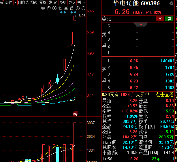 公開交易數(shù)據(jù)顯示,華電遼能近期持續(xù)快速上漲。自3月16日以來,截至3月20日收盤,華電遼能連續(xù)漲停,連續(xù)五個交易日內(nèi)日收盤價格漲幅偏離值累計達到64.72%。其中,3月20日,華電遼能共計成交393.7萬手,成交額24.16億元,換手率26.74%,均創(chuàng)下近期新高。