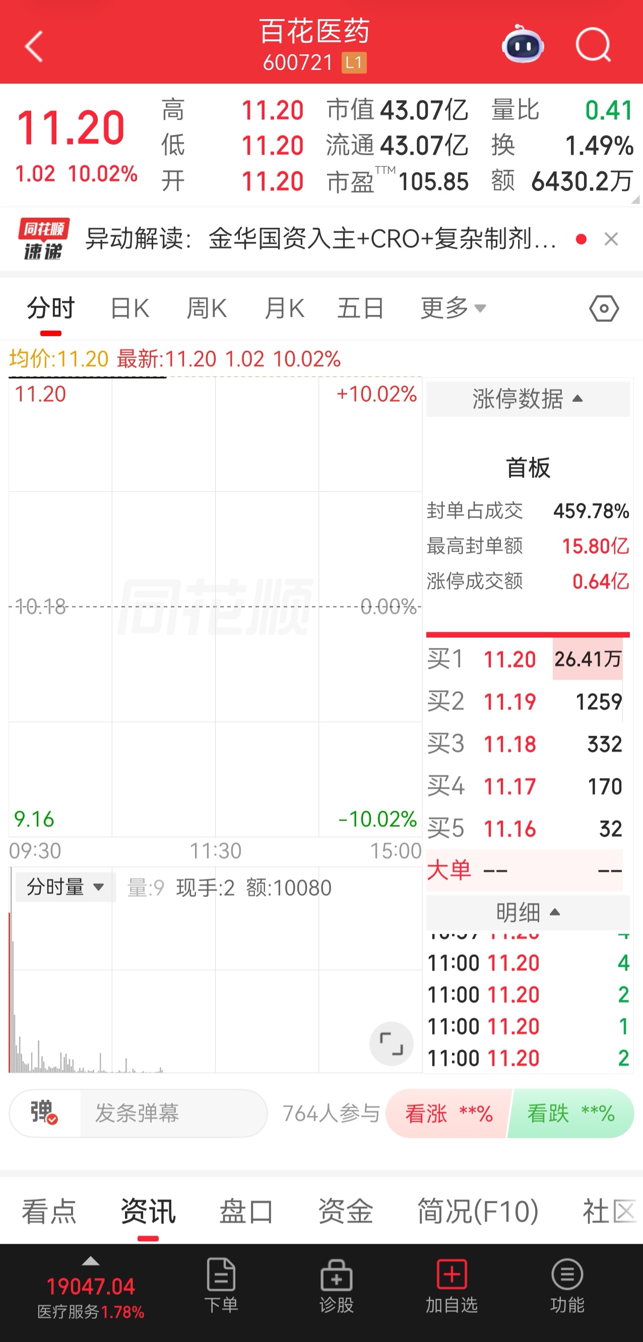 4月8日,百花醫(yī)藥(證券代碼:600721)復(fù)牌首日開盤即封漲停,報(bào)11.20元/股,截至記者發(fā)稿時,漲停板仍被牢牢封死。