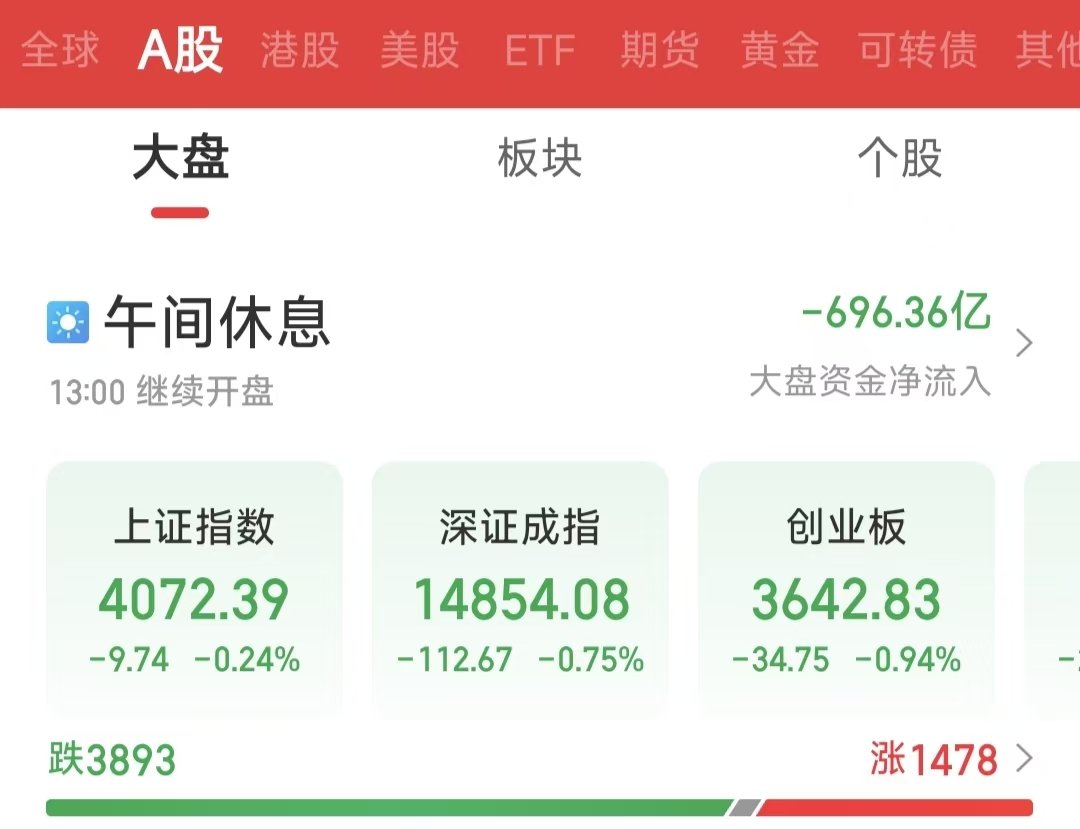 周二(4月21日)早盤上證指數(shù)呈現(xiàn)窄幅震蕩格局。截至上午收盤,上證指數(shù)下跌0.24%,報4072.39點;深證成指下跌0.75%,報14854.08點;創(chuàng)業(yè)板指下跌0.94%,報3642.83點。滬深兩市合計成交額約1.57萬億元。總體來看,個股跌多漲少,共有1478只個股實現(xiàn)上漲。