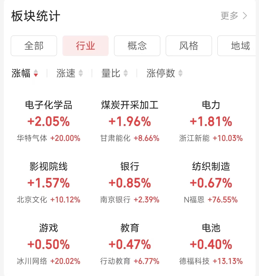 行業(yè)熱點方面,iFinD數(shù)據(jù)顯示,截至4月21日上午收盤,在同花順A股二級行業(yè)中,電子化學(xué)品行業(yè)漲幅達到2.05%,位居榜首。煤炭開采加工(漲幅1.96%)、電力(漲幅1.81%)、影視院線(漲幅1.57%)等行業(yè)緊隨其后。此外,銀行、紡織制造、游戲、教育、電池等行業(yè)也表現(xiàn)活躍,漲幅均超過0.4%。