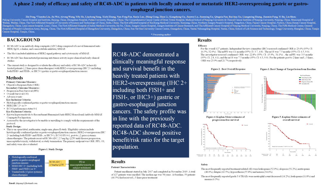 受新冠疫情影響,2020年美國(guó)臨床腫瘤學(xué)會(huì)(ASCO)年會(huì)由線下轉(zhuǎn)為線上虛擬會(huì)議,于5月29日至6月2日舉行。榮昌生物制藥(煙臺(tái))股份有限公司(下稱“榮昌生物”)自主創(chuàng)新抗體偶聯(lián)(ADC)藥物RC48(愛(ài)地希)在此次會(huì)議展示了最新研究進(jìn)展,由北京大學(xué)腫瘤醫(yī)院沈琳教授牽頭的“RC48治療HER2過(guò)表達(dá)的局部晚期或轉(zhuǎn)移性胃癌II期臨床研究”入選大會(huì)壁報(bào)展示,于北京時(shí)間2020年5月30日公布。