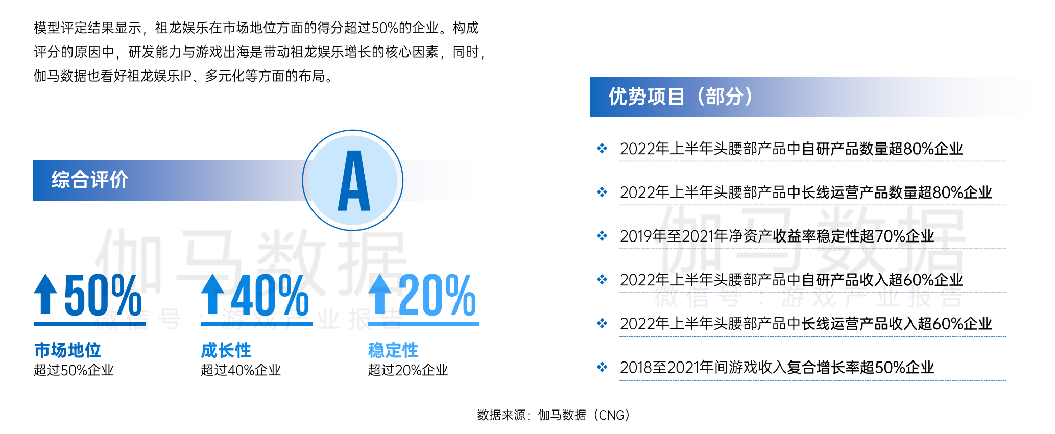 在全球化進程不斷深化、研發(fā)優(yōu)勢加持,以及IP、多元化等方面的布局下,祖龍娛樂在《2022年上市游戲企業(yè)競爭力報告》中,已經(jīng)進入top25并躋身“潛力企業(yè)”行列。同時,祖龍娛樂也榮獲伽馬數(shù)據(jù)頒發(fā)的2022年度中國游戲企業(yè)“白馬獎”。