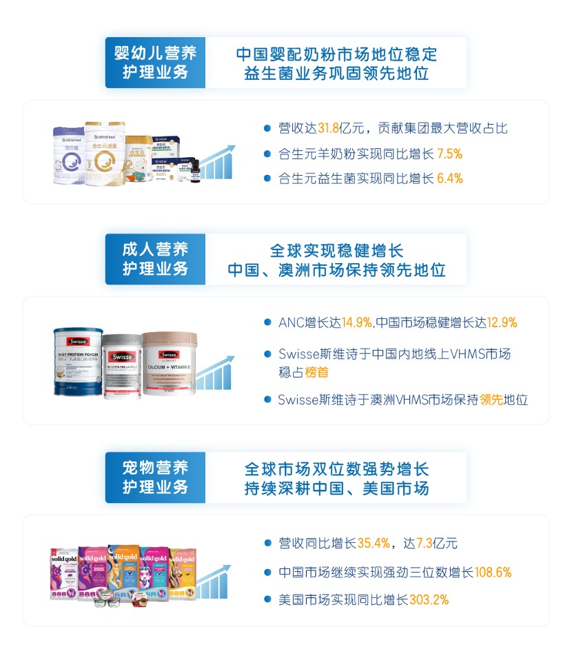 健合集團(tuán)致力于全家庭營養(yǎng)健康。其中,嬰幼兒營養(yǎng)與護(hù)理用品業(yè)務(wù)(BNC)在中國嬰幼兒配方奶粉市場維持穩(wěn)定地位,益生菌業(yè)務(wù)實(shí)現(xiàn)6.4%增長,羊奶實(shí)現(xiàn)7.5%增長;成人營養(yǎng)與護(hù)理用品業(yè)務(wù)(ANC)同比實(shí)現(xiàn)14.9%穩(wěn)健增長,中國市場保持線上領(lǐng)先地位,為主要貢獻(xiàn)者,澳新市場實(shí)現(xiàn)穩(wěn)健增長;寵物營養(yǎng)與護(hù)理用品業(yè)務(wù)(PNC)營收7.3億元,同比實(shí)現(xiàn)增長35.4%。