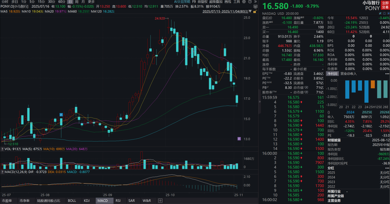 實(shí)際上,自10月2日小馬智行股價(jià)創(chuàng)下歷史新高24.92美元/股后,截至美國當(dāng)?shù)貢r(shí)間11月4日,其股價(jià)回調(diào)幅度已超過33%。